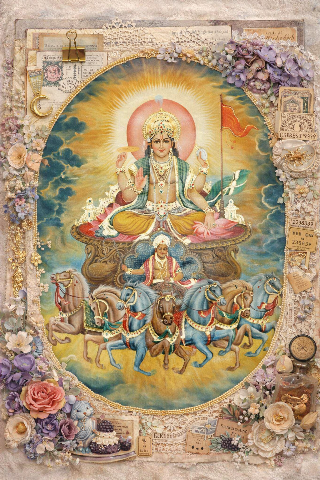 Surya is the sun deity, representing vitality, clarity, and steady life force.